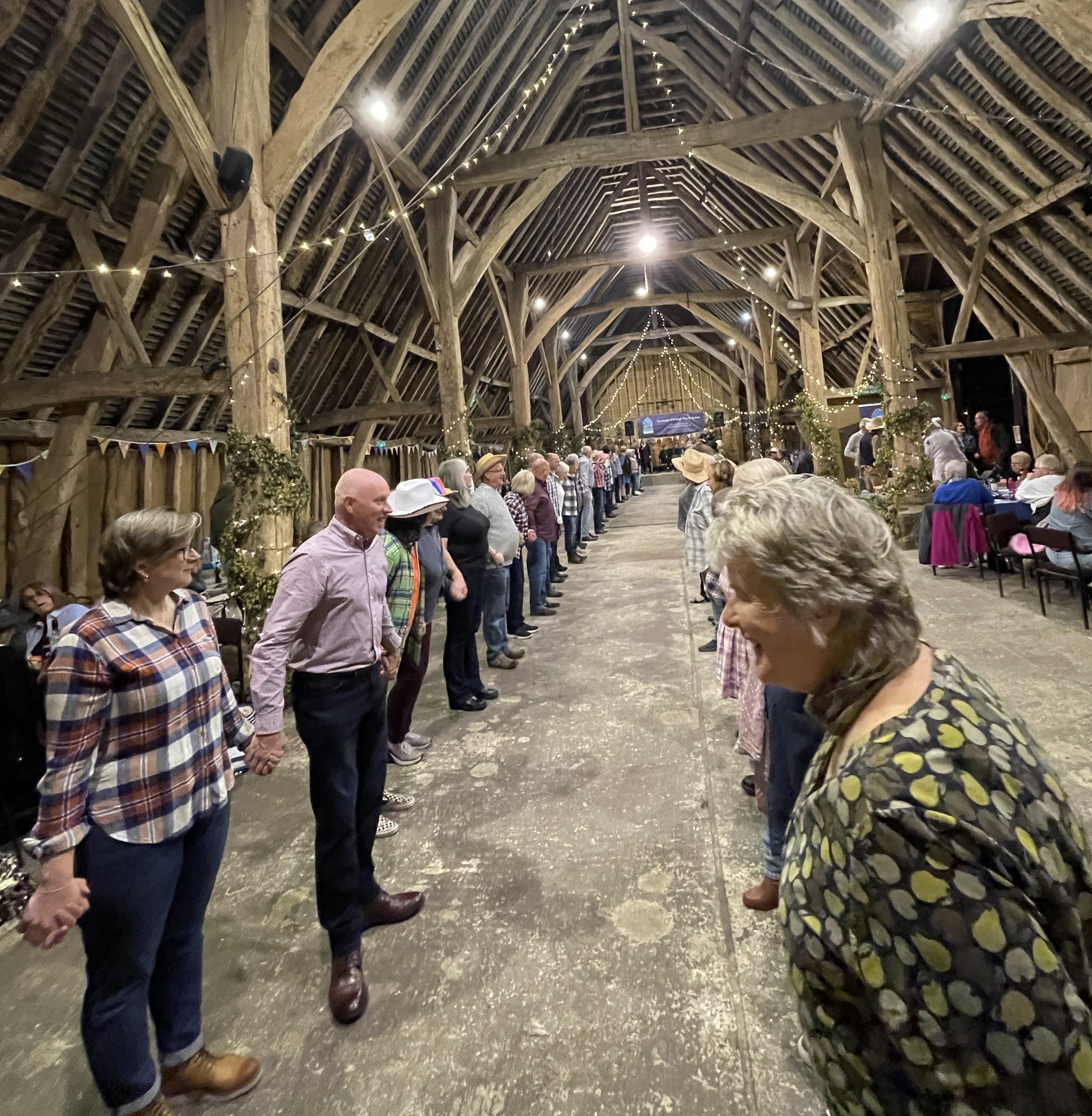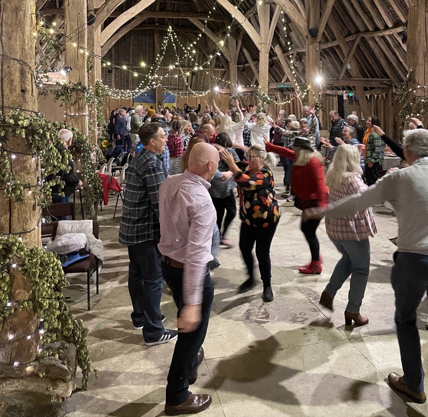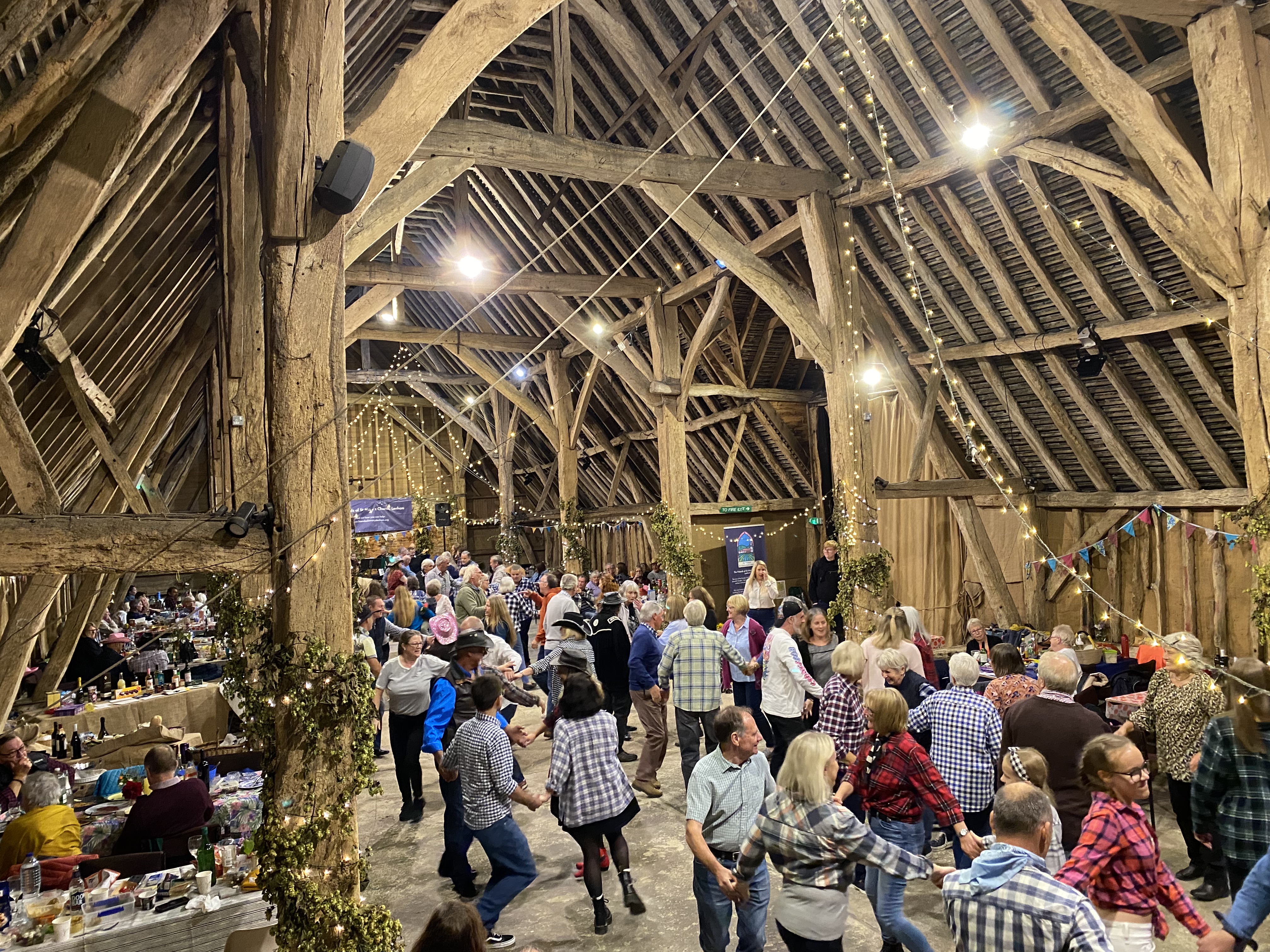 We were so pleased to welcome almost 200 enthusiastic attendees to our barn dance on 24th September, 2022. After a two-year enforced break due to the pandemic, it was wonderful to see so many people enjoying the evening, with faces both familiar and new. The fabulous Tithe Barn was the perfect venue, with fairy lights and bunting adding to the atmosphere.