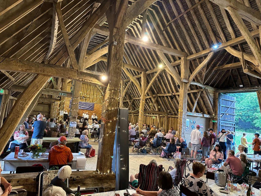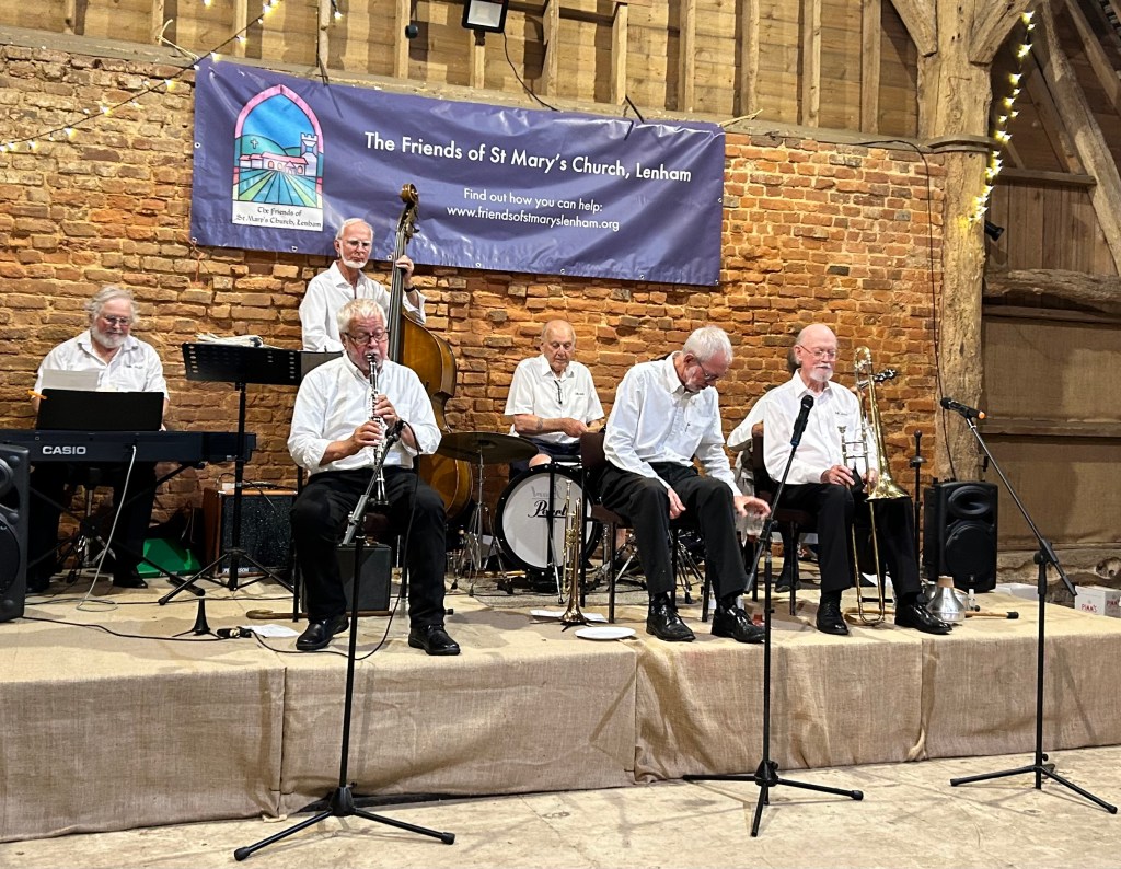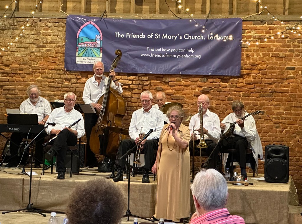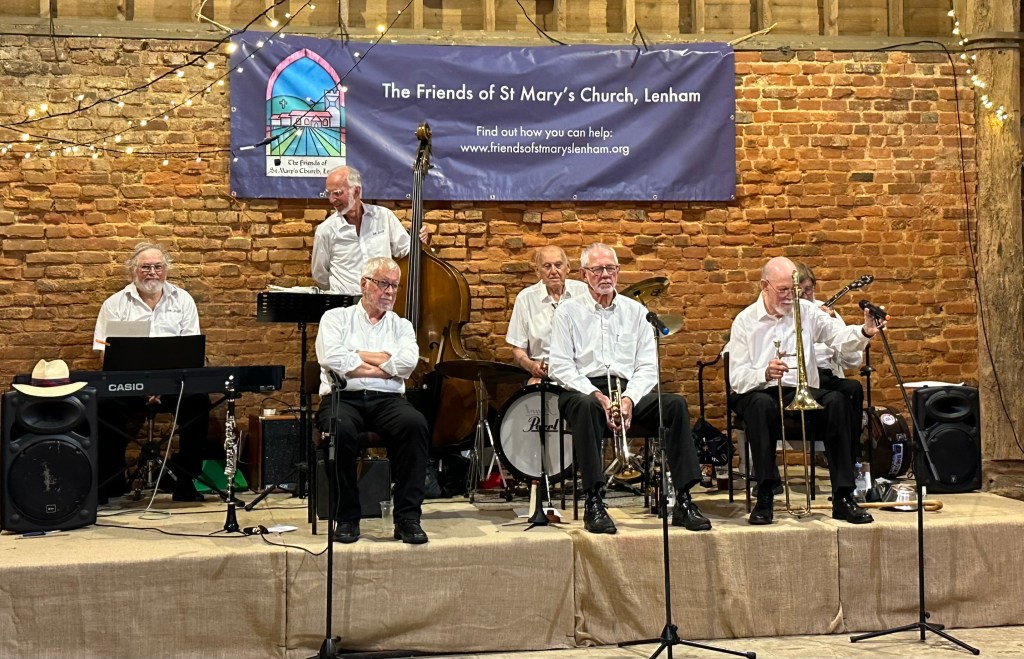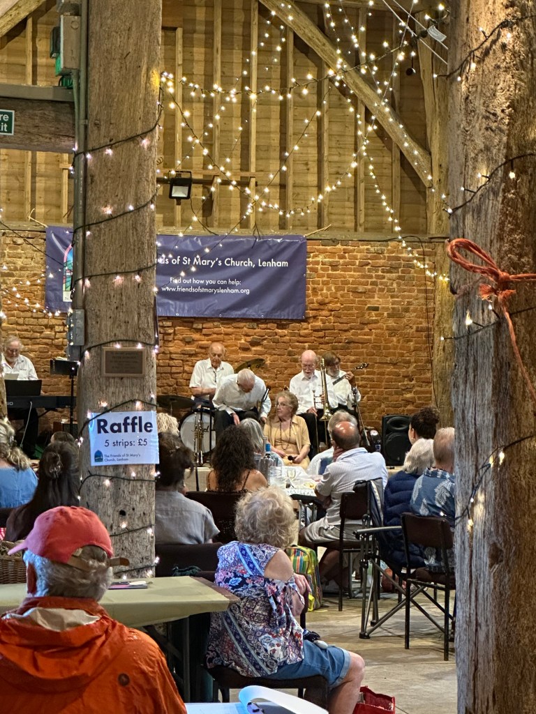 We had a wonderful afternoon on Sunday 18th June, listening to the sounds of Doctor Jazz, a great local 7-piece jazz ensemble plus Lyn Falvey, their fabulous lead singer. The Tithe Barn provided the beautiful setting for the event. We’d hoped to hold the concert outside, but due to the unreliable weather, we held the concert inside. That didn’t stop a number of attendees from enjoying the sunshine before the concert, having their picnic lunches in the field behind the barn.